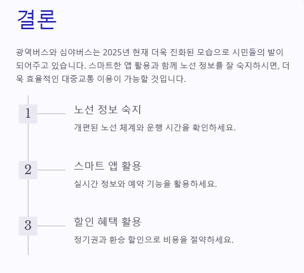 광역버스와 심야버스는 2025년 현재 더욱 진화된 모습으로 시민들의 발이 되어주고 있습니다. 스마트한 앱 활용과 함께 노선 정보를 잘 숙지하시면, 더욱 효율적인 대중교통 이용이 가능할 것입니다.