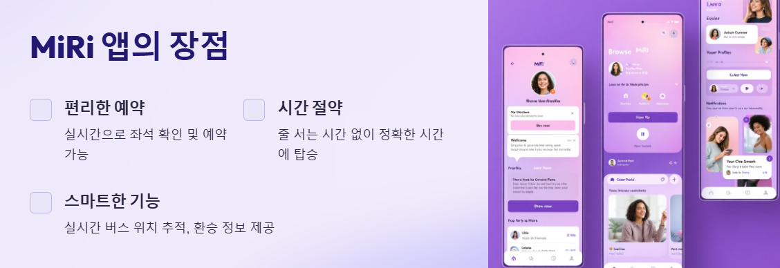 MiRi 앱은 단순한 좌석 예약을 넘어 우리의 이동 생활을 한층 더 편리하게 만들어주고 있습니다. 실시간 예약부터 다양한 부가 기능까지, 이제 광역버스 이용이 더욱 스마트해졌습니다. 지금 바로 MiRi 앱을 다운로드하여 새로운 버스 라이프를 경험해 보세요!