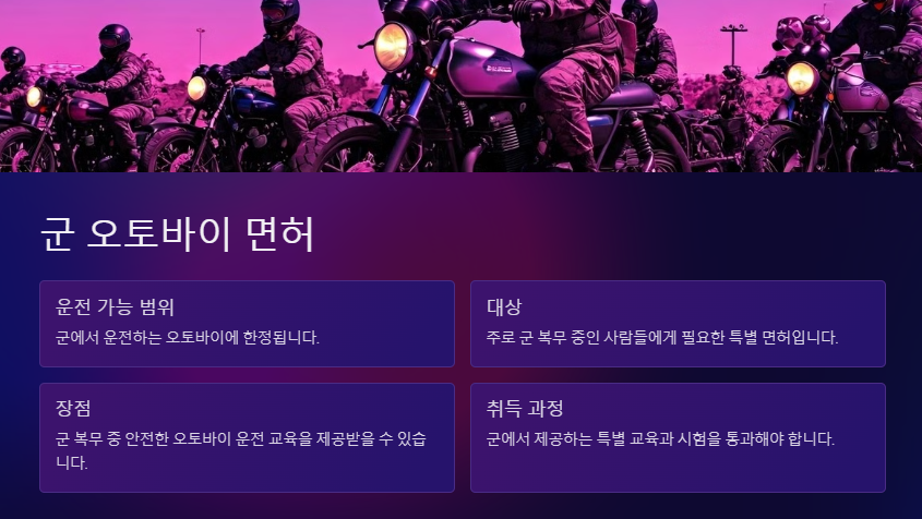 | 군 오토바이 면허 | 군용 오토바이 | 군 복무 중 운전 가능 | 군에서 제공 |