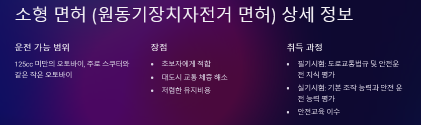 A1: 소형 면허는 필기시험과 도로주행 시험을 통과해야 하며, 이론 교육도 이수해야 합니다.