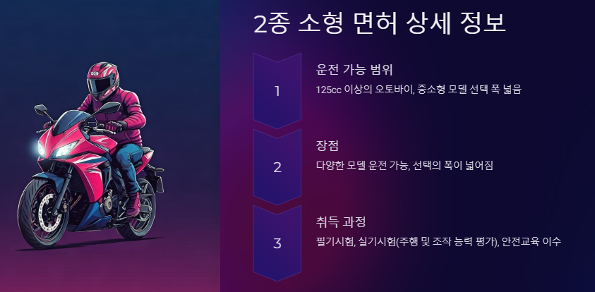 | 2종 소형 면허 | 125cc 이상 오토바이 | 다양한 종류의 오토바이 운전 가능 | 필수 |
