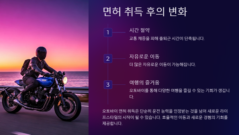 - 중소형 오토바이를 운전할 수 있어 선택의 폭이 넓어짐