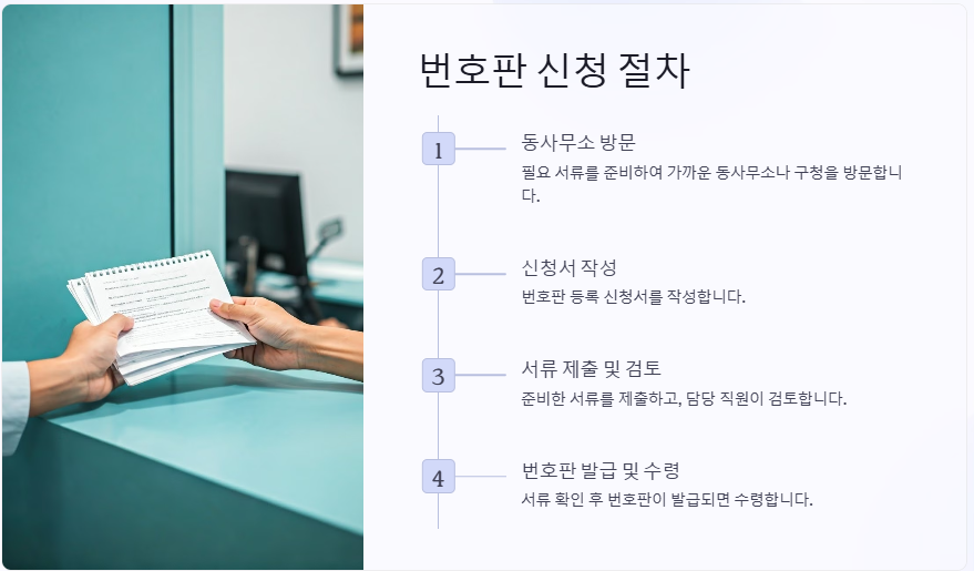 - 번호판 수령: 발급된 번호판을 수령합니다.