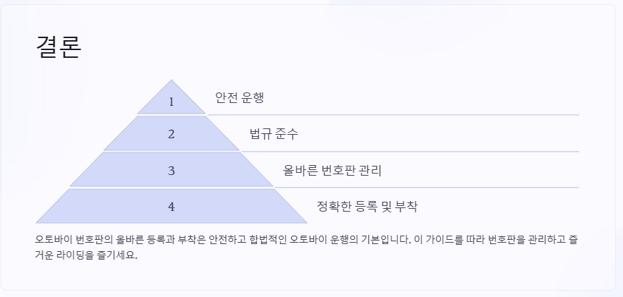 올바른 방법을 따라 번호판을 등록하고 부착하여 안전하게 오토바이를 운행하세요. 번호판 훼손이나 분실 시에도 즉시 조치를 취하는 것이 중요합니다.