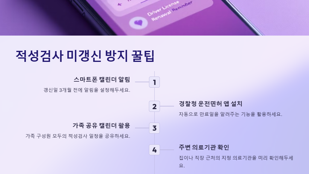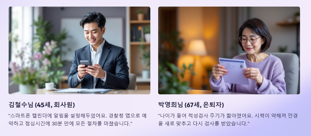 "평소 바쁜 회사 일정 때문에 적성검사 갱신 시기를 놓쳐 과태료를 낸 경험이 있습니다. 그 후로는 스마트폰 캘린더에 알림을 설정해 두었어요. 최근에는 경찰청 앱을 통해 예약하고 점심시간을 이용해 30분 만에 모든 절차를 마쳤습니다. 미리 계획하면 생각보다 간단한 과정이었습니다."