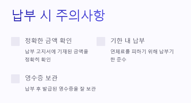 - 연체 시 불이익: 납부기한을 넘기면 연체료가 발생할 수 있으므로 반드시 기한 내에 납부해야 합니다.