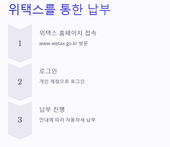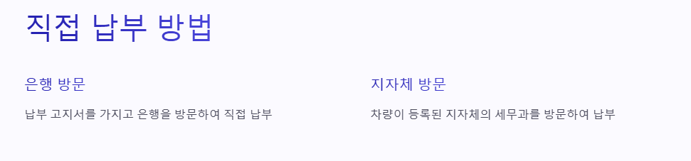 - 지자체 방문: 차량이 등록된 지자체의 세무과를 방문하여 납부할 수 있습니다.