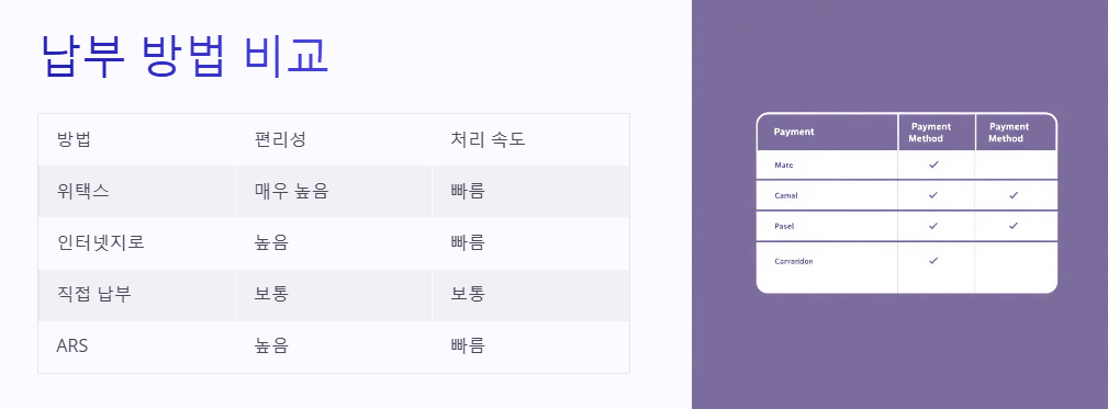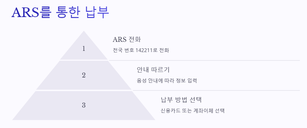 - 신용카드 또는 계좌이체: ARS 시스템을 통해 신용카드나 계좌이체로 납부할 수 있습니다.