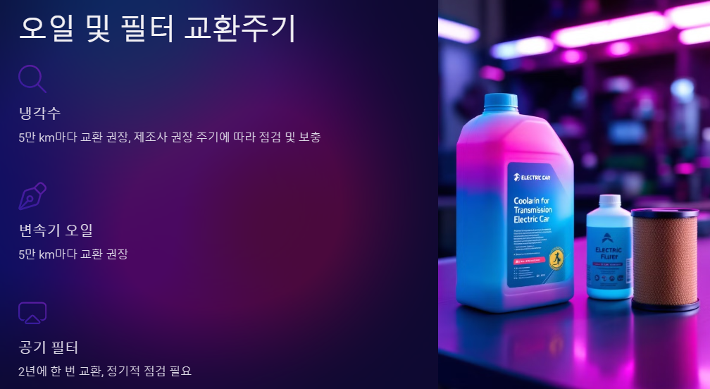 전기차는 전통적인 내연기관차와 달리 엔진오일이 필요하지 않지만, 냉각수와 변속기 오일, 공기 필터 등은 정기적으로 점검해야 합니다.