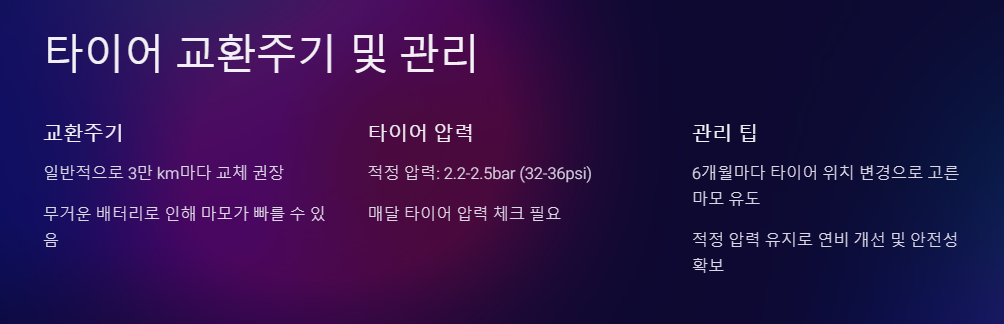A2: 타이어는 보통 3만 km마다 교환하며, 타이어 압력은 2.2~2.5 bar(32~36 psi)를 유지해야 합니다.