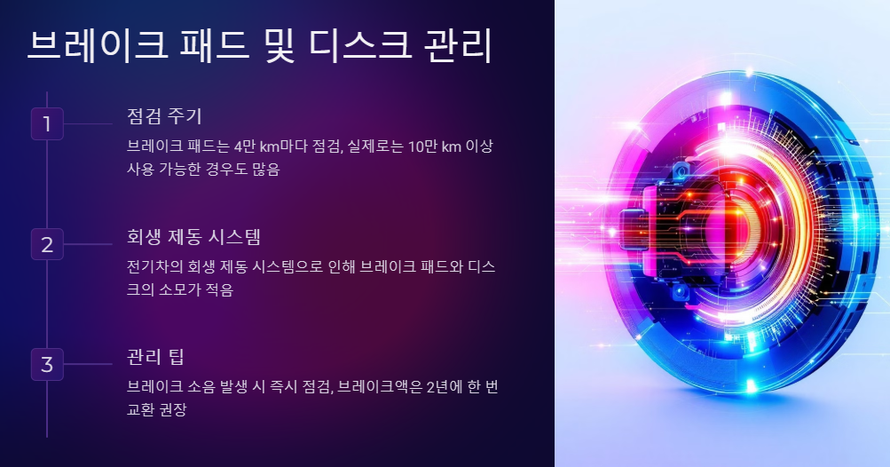 A3: 브레이크 패드는 4만 km마다 점검하되, 회생 제동 덕분에 보통 10만 km 이상 사용할 수 있습니다.