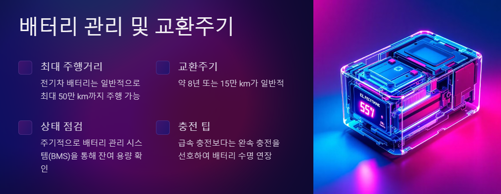 A1: 일반적으로 배터리는 최대 50만 km까지 사용 가능하지만, 배터리점검은 BMS를 통해 주기적으로 하는 것이 좋습니다.