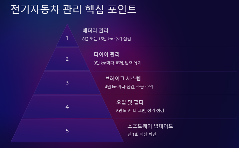 주행거리와 기간을 기준으로 배터리, 타이어, 브레이크 패드, 오일 및 필터, 소프트웨어 업데이트를 주의 깊게 점검하세요. 이렇게 관리하면 전기차 라이프를 더욱 즐겁고 안전하게 보낼 수 있습니다.