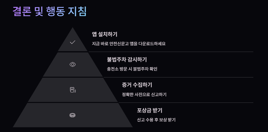 • 김민수(가명), 38세, 회사원: “충전소에 내연기관 차가 주차돼 있어 신고했는데, 2주 만에 5만 원 입금됐어요. 앱 사용도 쉬워서 자주 이용합니다.”
