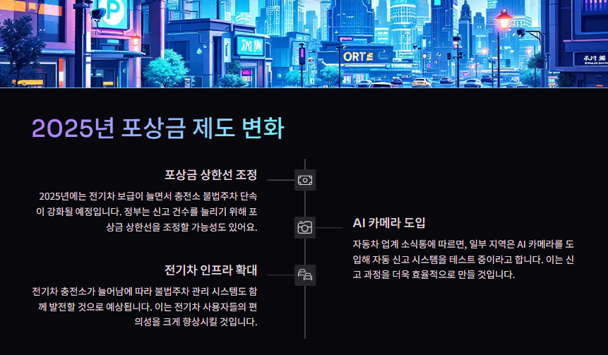 2025년에는 전기차 보급이 늘면서 충전소 불법주차 단속이 강화될 예정입니다. 정부는 신고 건수를 늘리기 위해 포상금 상한선을 조정할 가능성도 있어요. 자동차 업계 소식통에 따르면, 일부 지역은 AI 카메라를 도입해 자동 신고 시스템을 테스트 중이라고 합니다.