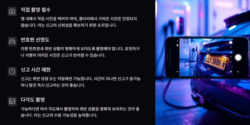 전기차를 사랑하는 여러분이라면 꼭 알아두셔야 할 정보입니다. 지금 앱을 설치하고, 불법주차를 발견하면 바로 신고해 보세요. 더 궁금한 점이 있다면 댓글로 남겨주세요. 당신의 작은 행동이 큰 변화를 만듭니다!