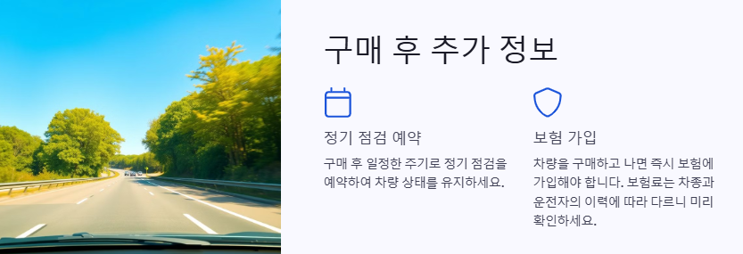- 정기 점검 예약: 구매 후 일정한 주기로 정기 점검을 예약하여 차량 상태를 유지하세요.
