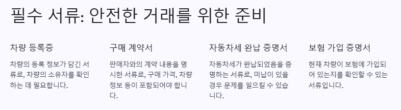 중고차 구매 시 필요한 서류와 구매 후 정비 항목을 잘 이해하면 보다 안전하고 효율적인 차량 구매가 가능합니다.