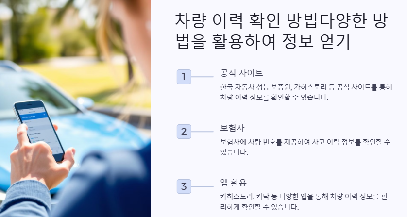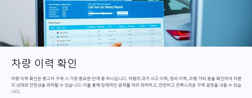 - 차량 이력 확인: 차량의 사고 이력과 정비 이력을 확인하여 구매 결정을 내리세요.