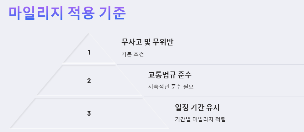 교통법규를 준수하고, 무사고 및 무위반 상태를 유지하면 마일리지가 쌓입니다.