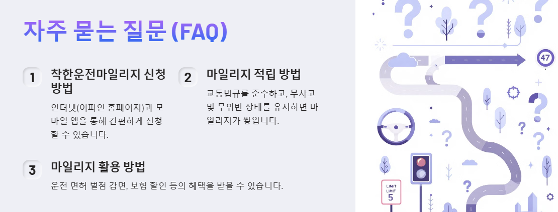 인터넷을 통해 간편하게 신청하고, 마일리지를 조회하는 방법을 알아보겠습니다. 안전운전을 통해 마일리지를 쌓고, 교통법규를 준수하는 습관을 길러보세요.