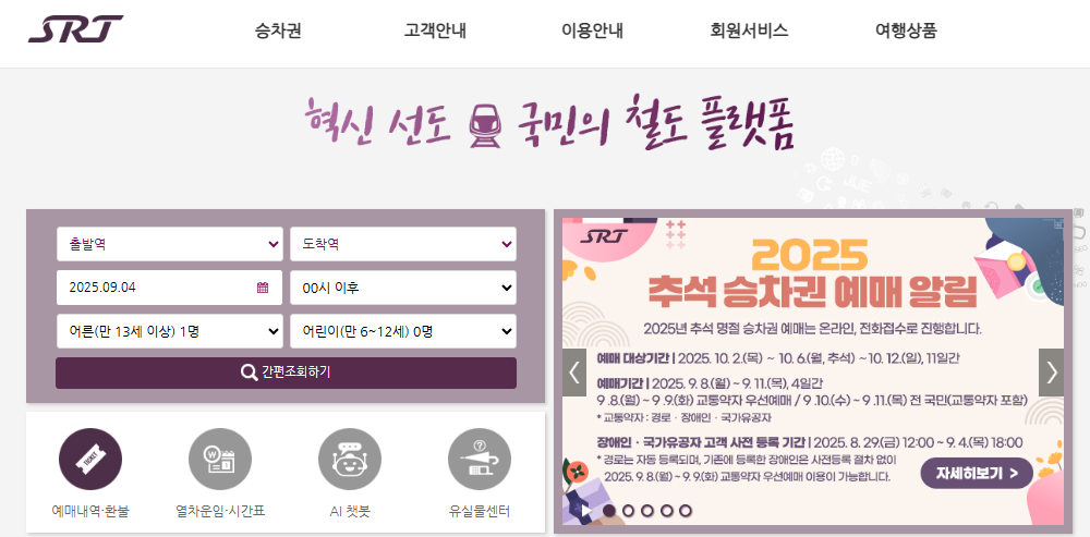 2025년 추석 코레일 기차표 예매는 SRT가 9월 8일, KTX가 9월 15일부터 시작됩니다.
