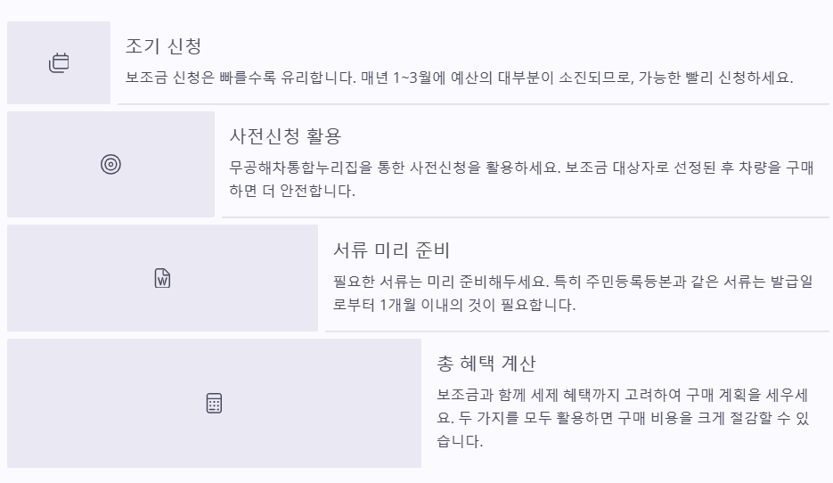 첫째, 보조금 신청은 빠를수록 유리합니다. 매년 1~3월에 예산의 대부분이 소진되므로, 가능한 한 빨리 신청하세요.