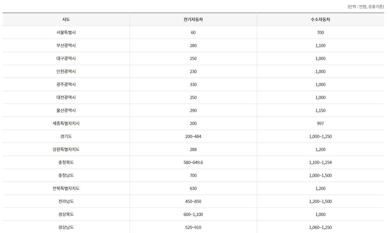 차종별 보조금 지원 금액