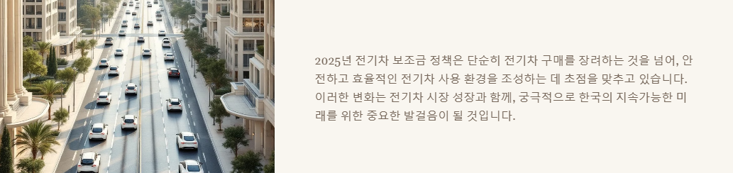 2025년 전기차 보조금 정책은 성능과 안전성을 중심으로 한 질적 성장에 초점을 맞추고 있습니다. 동시에 실수요자들의 부담을 덜어주는 세심한 지원책도 마련되어 있어, 전기차 시장의 건전한 발전을 이끌어낼 것으로 기대됩니다.