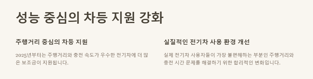 2025년부터는 주행거리와 충전 속도가 우수한 전기차에 더 많은 혜택이 주어집니다. 제가 보기에 이는 매우 합리적인 변화입니다. 실제 전기차 사용자들이 가장 불편해하는 부분이 바로 주행거리와 충전 시간이기 때문입니다.