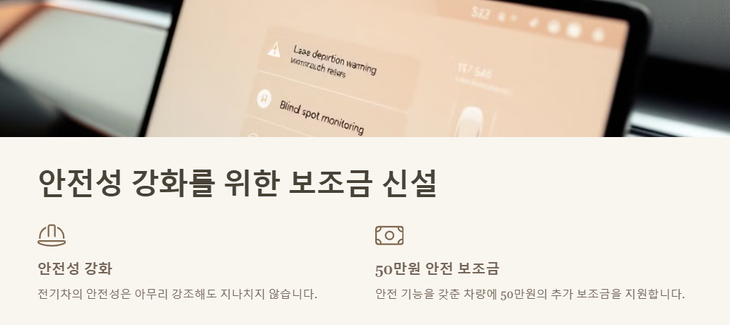 신설 전기차의 안전성은 아무리 강조해도 지나치지 않습니다. 새롭게 도입된 안전 보조금 50만 원은 다음 기능들을 갖춘 차량에 지원됩니다.